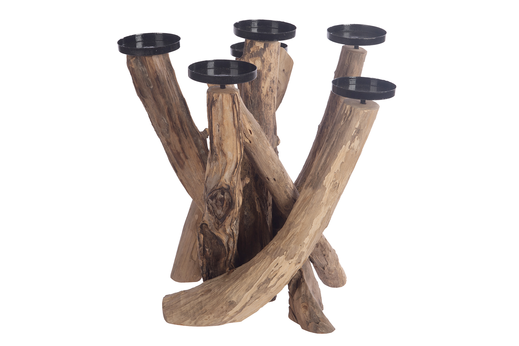 Een mooie kaarsenstandaard die geschikt is voor 5 kaarsen. De kandelaar is gemaakt van teak en metaal. Breng de natuur in huis met de kandelaar. Afm. 30*40 cm